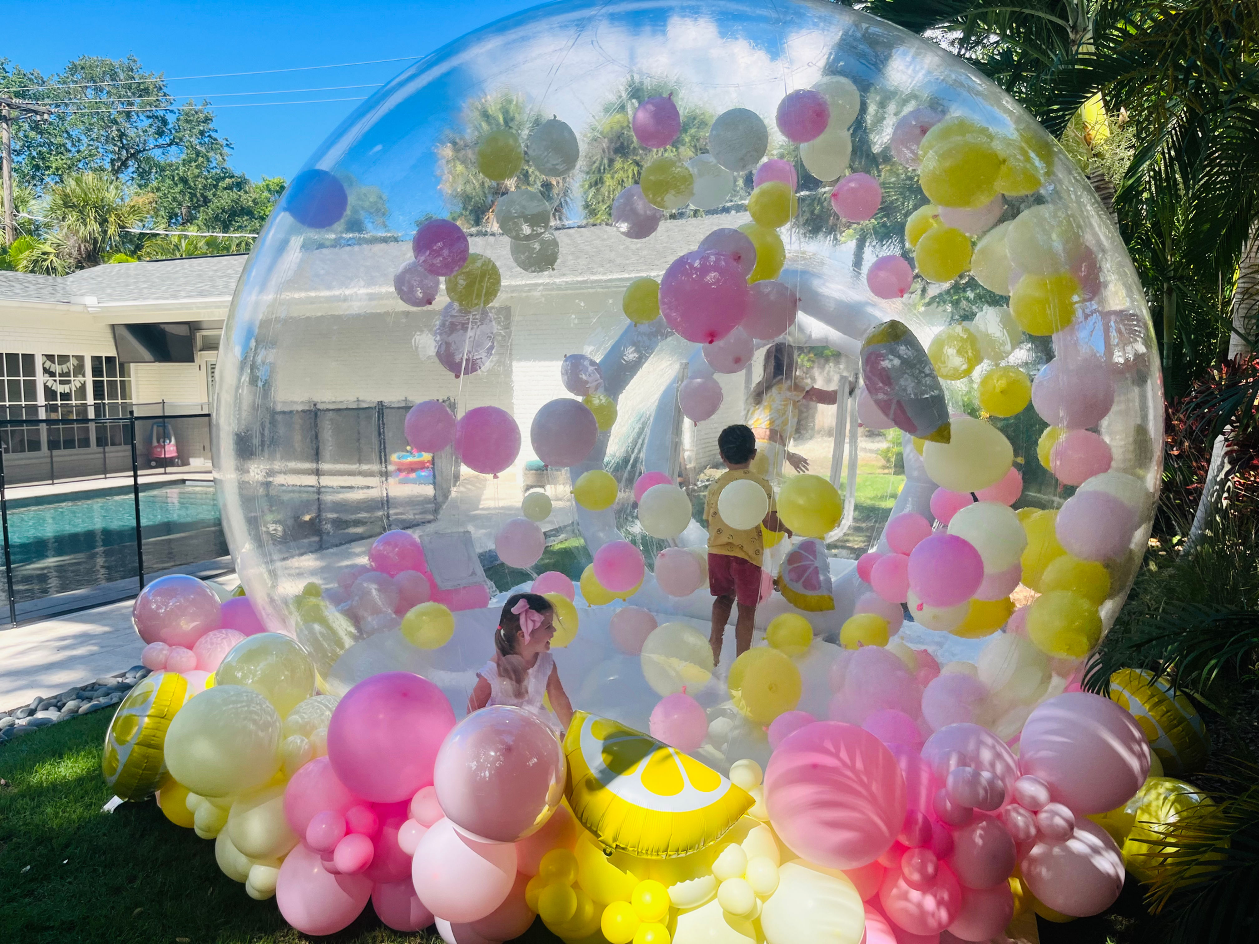 Elevate your bubble house with a balloon garland and bubble machine! Top Party Rentals in Lakeland!